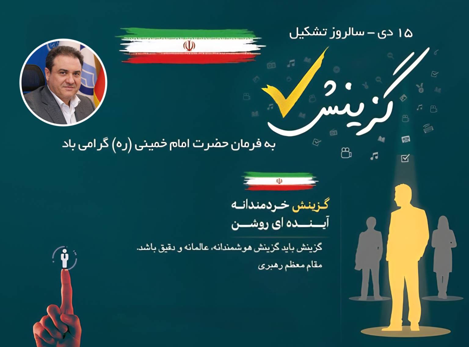 🔷 اینجانب فرا رسیدن پانزدهم دی ماه سالروز صدور فرمان امام خمینی (ره) مبنی بر تشکیل گزینش را به تمامی متولیان این عرصه ، بویژه کارکنان دفتر هسته گزینش شرکت آب و فاضلاب استان البرز تبریک عرض نموده و ضمن قدردانی از اقدامات ارزشمند بعمل آمده ، موفقیت و سربلندی تلاشگران این عرصه را از درگاه خداوند متعال خواستارم.
